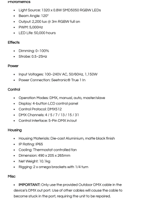 Outdoor Wash Panel Light with 1320 x 0.8W RGBW LEDs, 6 segment control, 120° Beam Angle, IP65, True1 in, 5 pin DMX in/out